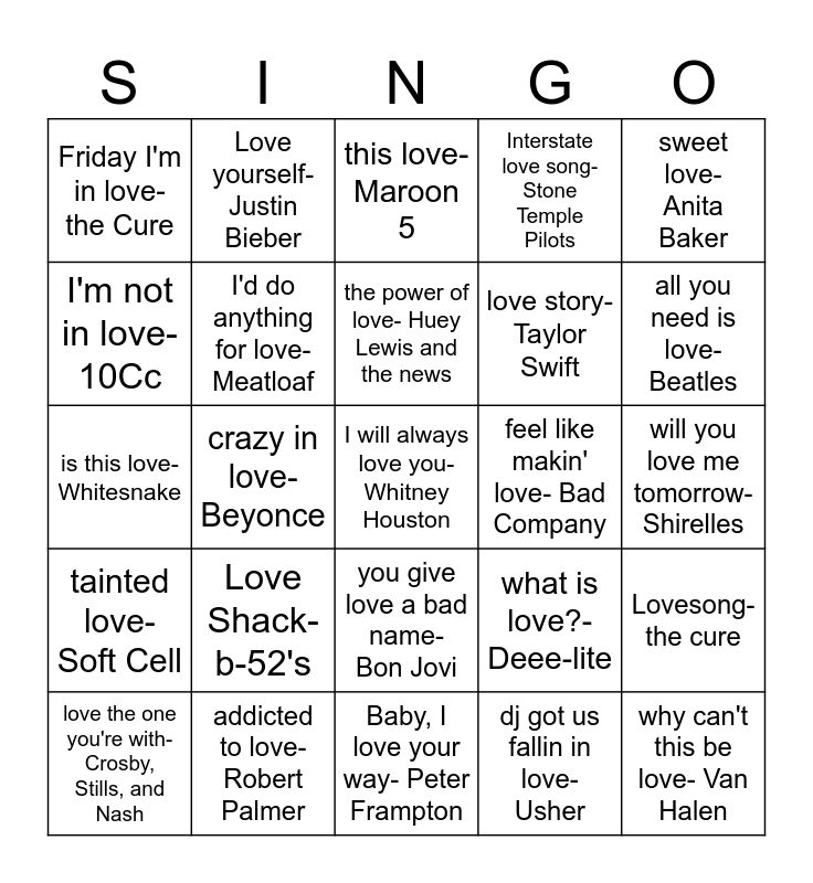 This bingo card has 50 words: how deep is your love- Bee Gees, I will always love you- Whitney Houston, silly love songs- McCartney and the wings, Baby, I love your way- Peter Frampton, Love Shack- b-52's, love machine- Miracles, Love yourself- Justin Bieber, somebody to love- Jefferson Airplane, I'm not in love- 10Cc, sunshine of your love- Cream, I'd do anything for love- Meatloaf, Interstate love song- Stone Temple Pilots, Lovesong- the cure, what is love?- Deee-lite, love her madly- the doors, jump (for my love)- Pointer Sisters, the power of love- Huey Lewis and the news, feel like makin' love- Bad Company, no ordinary love- Sade, sweet love- Anita Baker, crazy in love- Beyonce, dj got us fallin in love- Usher, Friday I'm in love- the Cure, love story- Taylor Swift, my love- Justin Timberlake, why can't this be love- Van Halen, all you need is love- Beatles, I just called to say I love you- Stevie Wonder, this love- Maroon 5, you give love a bad name- Bon Jovi, I love this bar- Toby Keith, hello, I love you- the Doors, love the way you lie- Eminem, whole lotta love- Led Zeppelin, addicted to love- Robert Palmer, Baby love- Supremes, Stop! in the name of love- supremes, love hurts- Nazareth, crazy little thing called love- Queen, will you love me tomorrow- Shirelles, love me do- beatles, you can't hurry love- supremes, I want to know whay love is- Foreigner, greatest love of all- Whitney Houston, love the one you're with- Crosby, Stills, and Nash, is this love- Whitesnake, Can't help falling in love- Elvis Presley, keep on lovin you- REO Speedwagon, tainted love- Soft Cell and when a man loves a woman- Percy Sledge.