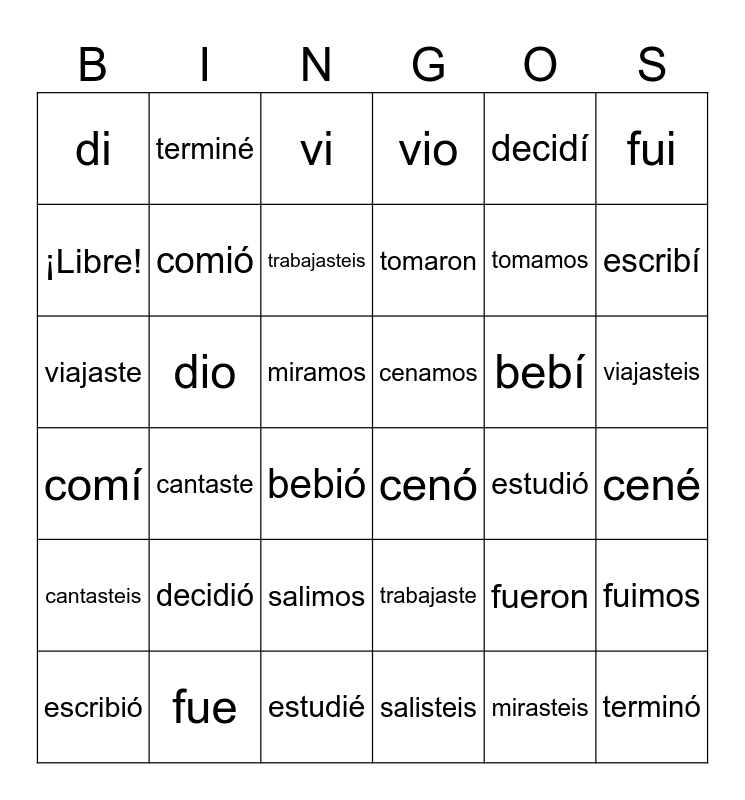 This bingo card has 36 words: comí, cantaste, estudié, tomaron, bebí, viajasteis, di, fue, vi, trabajaste, tomamos, fui, cantasteis, dio, trabajasteis, vio, fueron, cené, ¡Libre!, comió, bebió, cenó, estudió, fuimos, viajaste, terminé, miramos, salisteis, decidí, escribí, escribió, decidió, salimos, cenamos, mirasteis and terminó.
