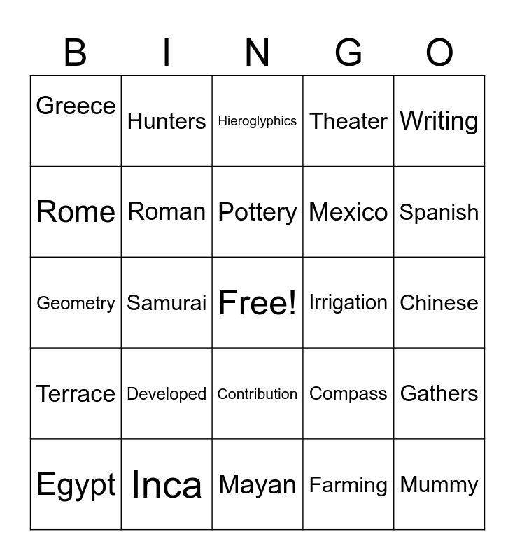 This bingo card has a free space and 29 words: Egypt, China, Samurai, Japan, Greece, Hieroglyphics, Roman, Developed, Irrigation, Inca, Chinese, Mummy, Mayan, Farming, Spanish, Aztec, Contribution, Terrace, Writing, Geometry, Compass, Great wall of China, Mexico, Rome, Theater, Hunters, Gathers, Pottery and Calender.