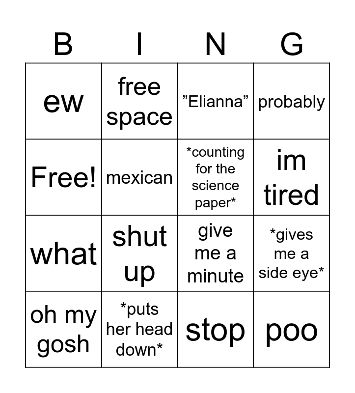 This bingo card has 16 words: *puts her head down*, *gives me a side eye*, ”Elianna”, ew, what, free space, give me a minute, stop, Free!, mexican, oh my gosh, probably, shut up, im tired, *counting for the science paper* and poo.