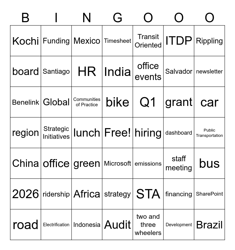 This bingo card has a free space and 48 words: STA, Salvador, Audit, Strategic Initiatives, Communities of Practice, Public Transportation, Funding, Electrification, ITDP, Microsoft, Rippling, Timesheet, grant, Q1, 2026, dashboard, board, newsletter, financing, Transit Oriented, office events, lunch, Kochi, Santiago, SharePoint, HR, car, road, bike, Global, Development, hiring, bus, ridership, region, emissions, staff meeting, Benelink, green, Africa, China, Brazil, Mexico, Indonesia, India, strategy, office and two and three wheelers.
