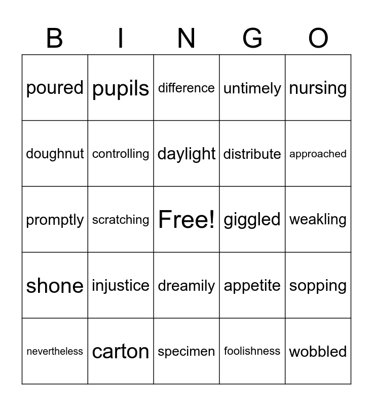 This bingo card has a free space and 25 words: injustice, specimen, daylight, nevertheless, nursing, poured, doughnut, pupils, giggled, dreamily, distribute, promptly, appetite, sopping, controlling, litter, weakling, difference, approached, scratching, wobbled, carton, shone, untimely and foolishness.