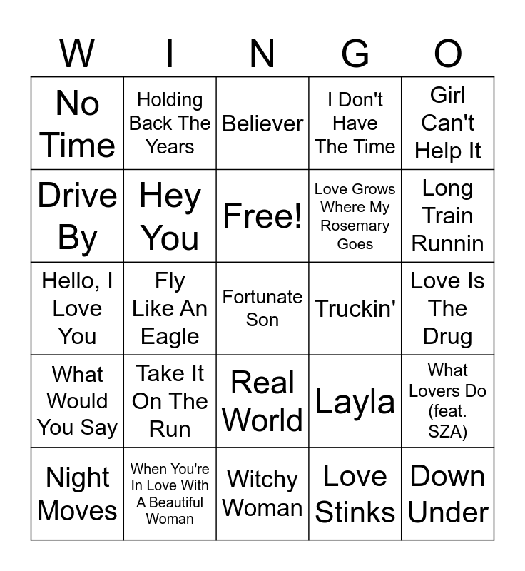 This bingo card has 76 words: Africa, Backstabber, Believer, Come Dancing, Come On Eileen, Cousin Dupree, Don't Bring Me Down, Don't Stand So Close To Me, Don't Stop The Dance, Double Vision, Down Under, Dreams, Free!, Drive By, End Of The Line, Fly Like An Eagle, For Your Love, Fortunate Son, Fox On The Run, Girl Can't Help It, Heat Of The Moment, Hello, I Love You, Hey You, Holding Back The Years, I Don't Have The Time, I Don't Know Why, I Got A Line On You, I Knew I Loved You (remix), I Won't Back Down, In A Gadda Da Vida, Invisible Touch, It's Alright, Just Can't Get Enough, Layla, Long Train Runnin, Love Grows Where My Rosemary Goes, Love Is Like A Rock, Love Is Reason, Love Is The Drug, Love Stinks, Love Walks In, Lowdown, Magic Carpet Ride, Maria Maria, Marrakesh Express, Money For Nothing, Night Moves, No Time, Pinball Wizard, Radio Ga Ga, Rag Doll, Real World, Rock And Roll All Nite, Rock The Casbah, Scars, Sharp Dressed Man, She's Not There, Some Kind of Wonderful, Start Me Up, Sumertime Blues, Take It On The Run, Talking In Your Sleep, That Smell, The Saga Of Pepote Rouge, The Search Is Over, The Things We Do For Love, Truckin', Union Of The Snake, Volunteers, We Gotta Get Out Of This Place (US Version), What Lovers Do (feat. SZA), What Would You Say, When You're In Love With A Beautiful Woman, Whip It, Witchy Woman and You Might Think.