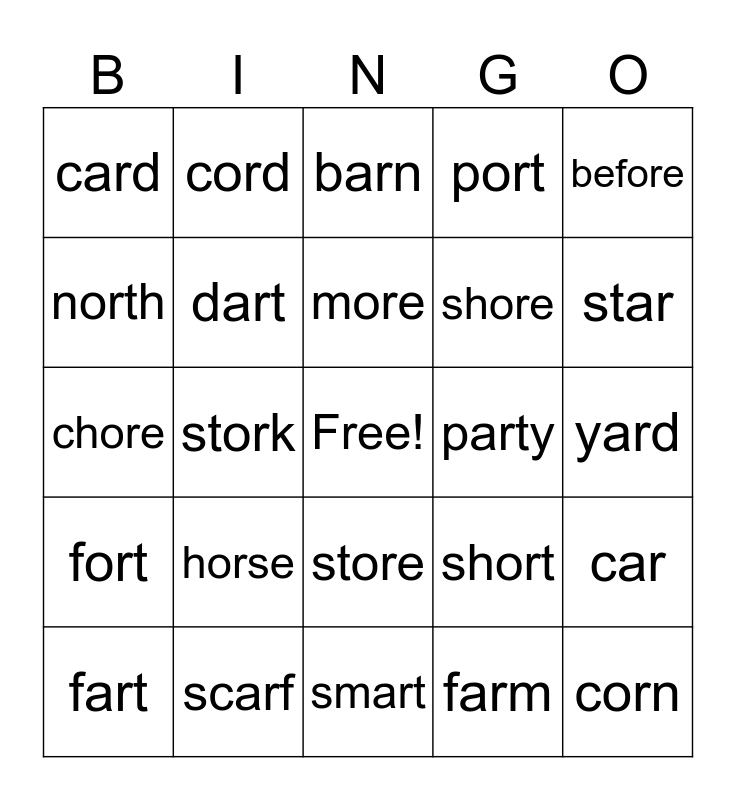 This bingo card has a free space and 29 words: fart, snore, stork, orbit, card, barn, dart, horse, party, scarf, yard, corn, smart, farm, star, ignore, store, fort, before, chore, short, garden, shore, north, port, cord, car, more and shark.
