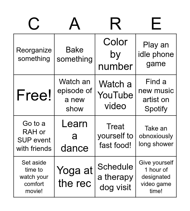 This bingo card has 16 words: Yoga at the rec, Take an obnoxiously long shower, Color by number, Reorganize something, Go to a RAH or SUP event with friends, Bake something, Treat yourself to fast food!, Schedule a therapy dog visit, Free!, Watch an episode of a new show, Set aside time to watch your comfort movie!, Play an idle phone game, Learn a dance, Find a new music artist on Spotify, Watch a YouTube video and Give yourself 1 hour of designated video game time!.