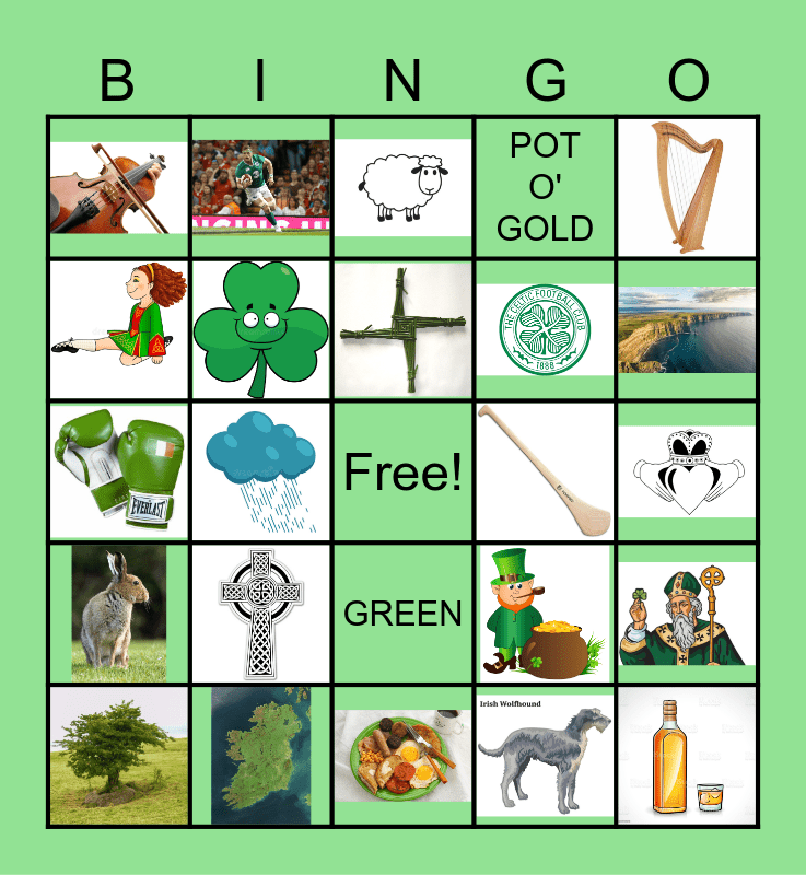This bingo card has 26 images, a free space and 3 words: GREEN, POT O' GOLD and PARADE.