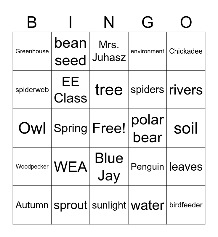 This bingo card has a free space and 29 words: Autumn, Summer, Spring, Winter, Greenhouse, Mrs. Juhasz, EE Class, WEA, polar bear, sprout, soil, birdfeeder, sunlight, water, rivers, Cardinal, Blue Jay, Woodpecker, Chickadee, Owl, Penguin, migration, spiders, spiderweb, environment, bean seed, leaves, tree and snow blanket.