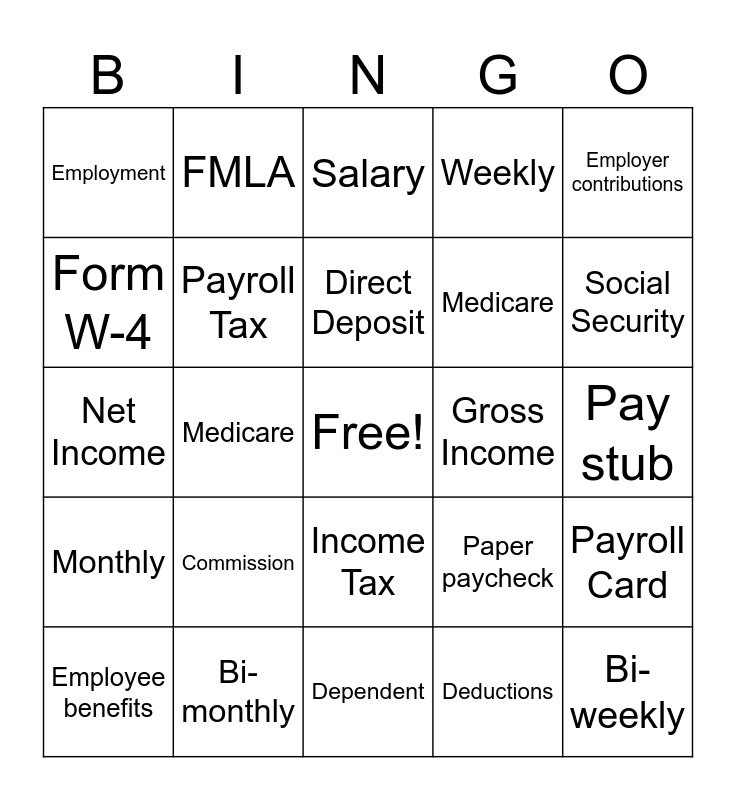 This bingo card has a free space and 25 words: Commission, Dependent, Direct Deposit, Employee benefits, Employer contributions, Employment, Form W-4, FMLA, Gross Income, Income Tax, Medicare, Net Income, Paper paycheck, Payroll Card, Payroll Tax, Pay Period, Pay stub, Salary, Social Security, Medicare, Bi-weekly, Bi-monthly, Monthly, Weekly and Deductions.