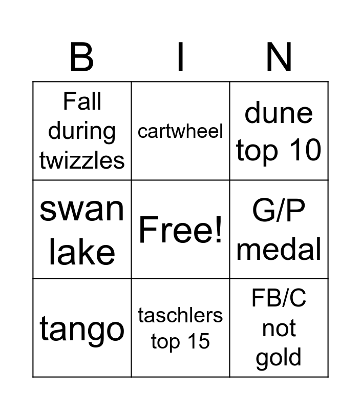 This bingo card has a free space and 8 words: G/P medal, dune top 10, cartwheel, tango, Fall during twizzles, FB/C not gold, swan lake and taschlers top 15.