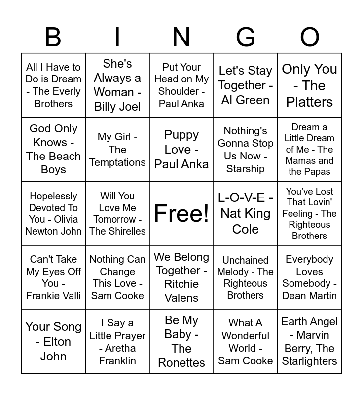 This bingo card has a free space and 30 words: I Say a Little Prayer - Aretha Franklin, Stand By Me - Ben E. King, Will You Love Me Tomorrow - The Shirelles, Then He Kissed Me - The Crystals, All I Have to Do is Dream - The Everly Brothers, Put Your Head on My Shoulder - Paul Anka, My Girl - The Temptations, We Belong Together - Ritchie Valens, L-O-V-E - Nat King Cole, Be My Baby - The Ronettes, You've Lost That Lovin' Feeling - The Righteous Brothers, Earth Angel - Marvin Berry, The Starlighters, What A Wonderful World - Sam Cooke, I Just Called to Say I Love You - Stevie Wonder, Dream a Little Dream of Me - The Mamas and the Papas, At Last - Etta James, Unchained Melody - The Righteous Brothers, Can't Take My Eyes Off You - Frankie Valli, Nothing Can Change This Love - Sam Cooke, Only You - The Platters, Hopelessly Devoted To You - Olivia Newton John, Time After Time - Cyndi Lauper, She's Always a Woman - Billy Joel, Nothing's Gonna Stop Us Now - Starship, God Only Knows - The Beach Boys, Let's Stay Together - Al Green, Everybody Loves Somebody - Dean Martin, Your Song - Elton John, Puppy Love - Paul Anka and Something - The Beatles.