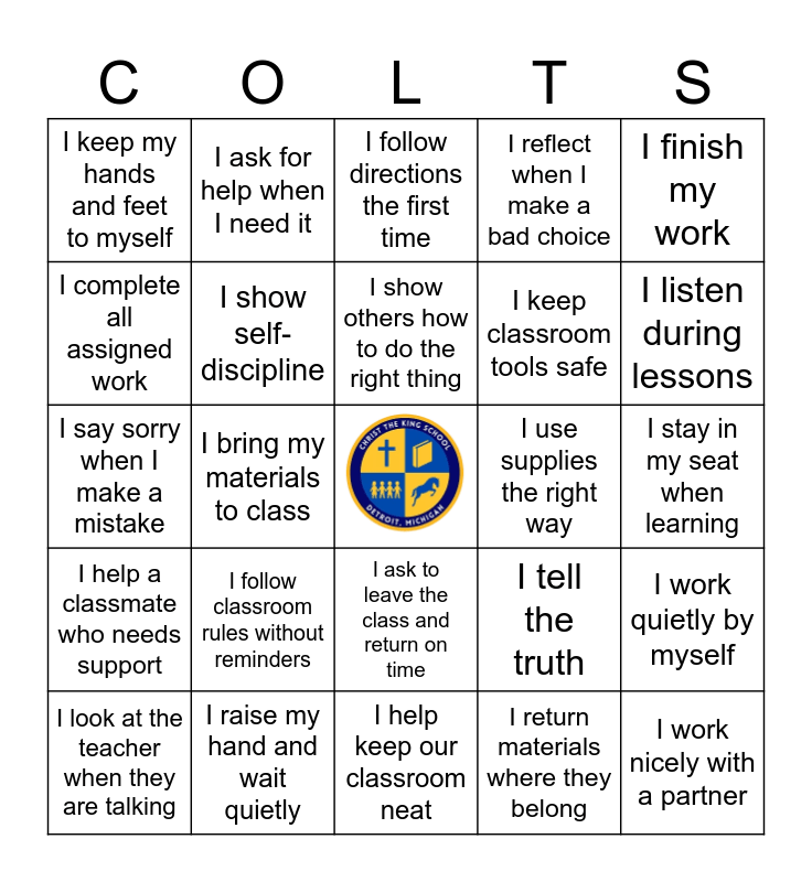 This bingo card has a free space and 29 words: I use kind words with my classmates, I raise my hand and wait quietly, I follow directions the first time, I don't cheat, I try my best, I finish my work, I keep my hands and feet to myself, I show self-discipline, I show others how to do the right thing, I use supplies the right way, I work quietly by myself, I look at the teacher when they are talking, I bring my materials to class, I return materials where they belong, I work nicely with a partner, I say sorry when I make a mistake, I accept consequence without getting upset, I help keep our classroom neat, I tell the truth, I listen during lessons, I help a classmate who needs support, I follow classroom rules without reminders, I walk safely in the classroom, I keep classroom tools safe, I stay in my seat when learning, I complete all assigned work, I ask for help when I need it, I ask to leave the class and return on time, I reflect when I make a bad choice and I don't lie to help myself out of trouble.