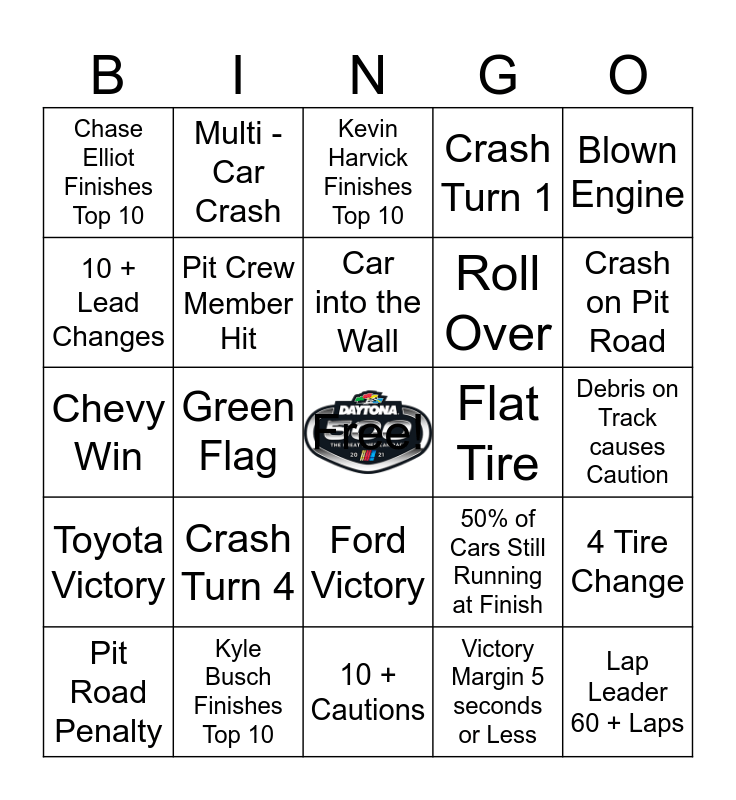 This bingo card has a free space and 24 words: Crash Turn 4, Kyle Busch Finishes Top 10, Car into the Wall, Pit Road Penalty, Blown Engine, Chase Elliot Finishes Top 10, 10 + Lead Changes, Multi -Car Crash, Flat Tire, Ford Victory, Roll Over, Chevy Win, 50% of Cars Still Running at Finish, 4 Tire Change, Pit Crew Member Hit, Victory Margin 5 seconds or Less, Debris on Track causes Caution, Kevin Harvick Finishes Top 10, Crash on Pit Road, Green Flag, Lap Leader 60 + Laps, Toyota Victory, Crash Turn 1 and 10 + Cautions.