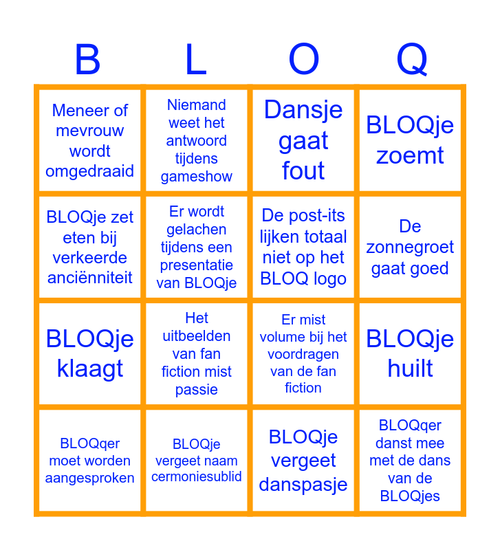 This bingo card has 20 words: BLOQje huilt, Cermoniesublid ziet het niet zitten, Dansje gaat fout, Ceremoniesublid moet lachen, BLOQqer moet worden aangesproken, BLOQje zet eten bij verkeerde anciënniteit, BLOQje vergeet naam cermoniesublid, Meneer of mevrouw wordt omgedraaid, BLOQje klaagt, Niemand weet het antwoord tijdens gameshow, Het uitbeelden van fan fiction mist passie, Er mist volume bij het voordragen van de fan fiction, Er wordt gelachen tijdens een presentatie van BLOQje, BLOQqer danst mee met de dans van de BLOQjes, De post-its lijken totaal niet op het BLOQ logo, Het tellen van een BLOQje wordt verstoord, De zonnegroet gaat goed, BLOQje zoemt, BLOQje vergeet danspasje and Cermoniesublid doet zuur.