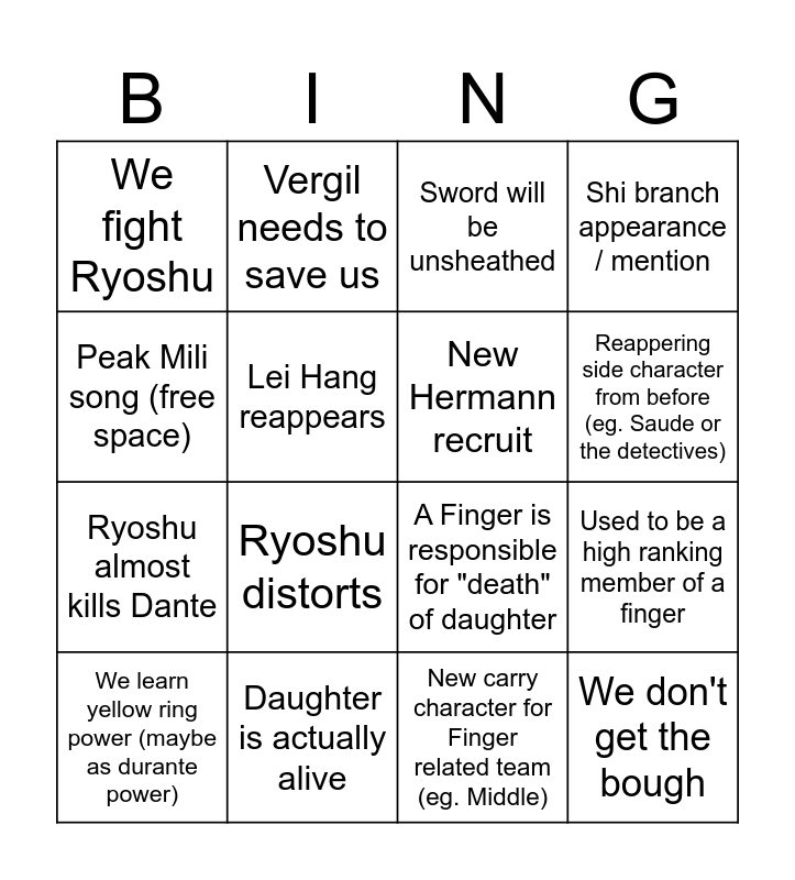 This bingo card has 16 words: Daughter is actually alive, Used to be a high ranking member of a finger, Sword will be unsheathed, We fight Ryoshu, Ryoshu almost kills Dante, Vergil needs to save us, A Finger is responsible for "death" of daughter, New carry character for Finger related team (eg. Middle), Peak Mili song (free space), Lei Hang reappears, We learn yellow ring power (maybe as durante power), Shi branch appearance / mention, Ryoshu distorts, Reappering side character from before (eg. Saude or the detectives), New Hermann recruit and We don't get the bough.