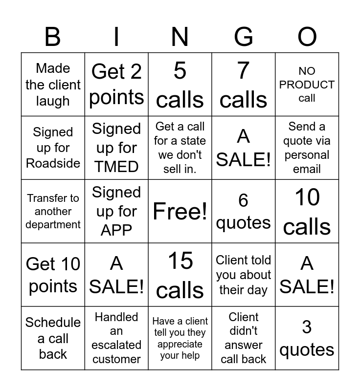This bingo card has a free space and 29 words: Schedule a call back, Get 4 points, Signed up for APP, 25 calls, Made the client laugh, 5 calls, Signed up for TMED, A SALE!, 6 quotes, Handled an escalated customer, 10 calls, 3 quotes, Have a client tell you they appreciate your help, Client didn't answer call back, Send a quote via personal email, A SALE!, 15 calls, Get 10 points, NO PRODUCT call, Transfer to another department, Client told you about their day, Hung up on, A SALE!, Signed up for Roadside, 7 calls, Get 2 points, A SALE!, Get a call for a state we don't sell in. and Set up a call back.