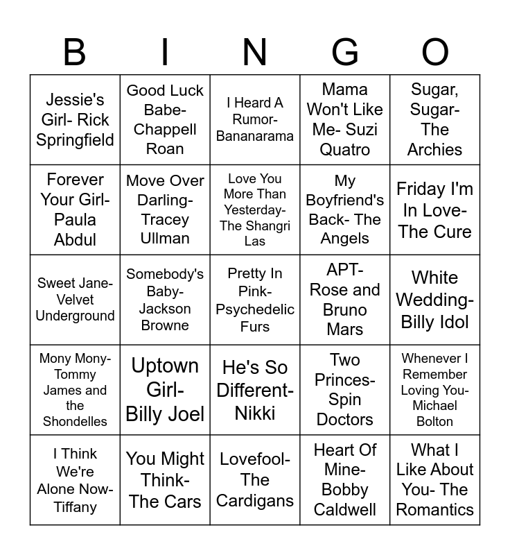This bingo card has a free space and 24 words: Uptown Girl- Billy Joel, You Might Think- The Cars, Love You More Than Yesterday- The Shangri Las, I Think We're Alone Now- Tiffany, Sugar, Sugar- The Archies, Jessie's Girl- Rick Springfield, Forever Your Girl- Paula Abdul, Good Luck Babe- Chappell Roan, APT- Rose and Bruno Mars, He's So Different- Nikki, My Boyfriend's Back- The Angels, Sweet Jane- Velvet Underground, Two Princes- Spin Doctors, Whenever I Remember Loving You- Michael Bolton, Move Over Darling- Tracey Ullman, Heart Of Mine- Bobby Caldwell, White Wedding- Billy Idol, I Heard A Rumor- Bananarama, Friday I'm In Love- The Cure, Somebody's Baby- Jackson Browne, What I Like About You- The Romantics, Mony Mony- Tommy James and the Shondelles, Mama Won't Like Me- Suzi Quatro and Lovefool- The Cardigans.