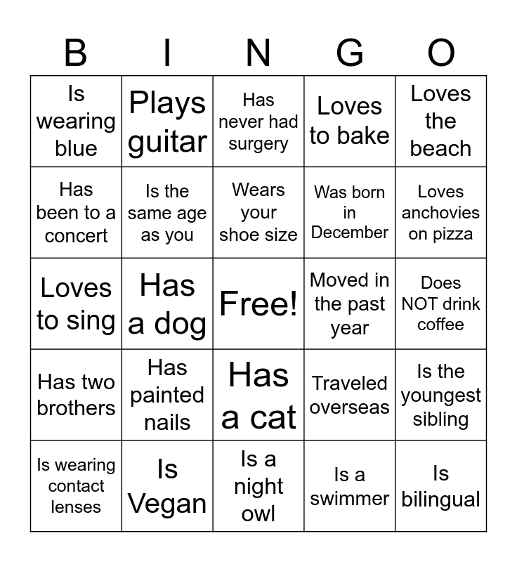 This bingo card has a free space and 24 words: Has painted nails, Is Vegan, Wears your shoe size, Is wearing contact lenses, Loves the beach, Is wearing blue, Has been to a concert, Plays guitar, Moved in the past year, Has a cat, Was born in December, Loves to sing, Traveled overseas, Is the youngest sibling, Is the same age as you, Is a swimmer, Does NOT drink coffee, Has never had surgery, Loves anchovies on pizza, Has a dog, Is bilingual, Has two brothers, Loves to bake and Is a night owl.
