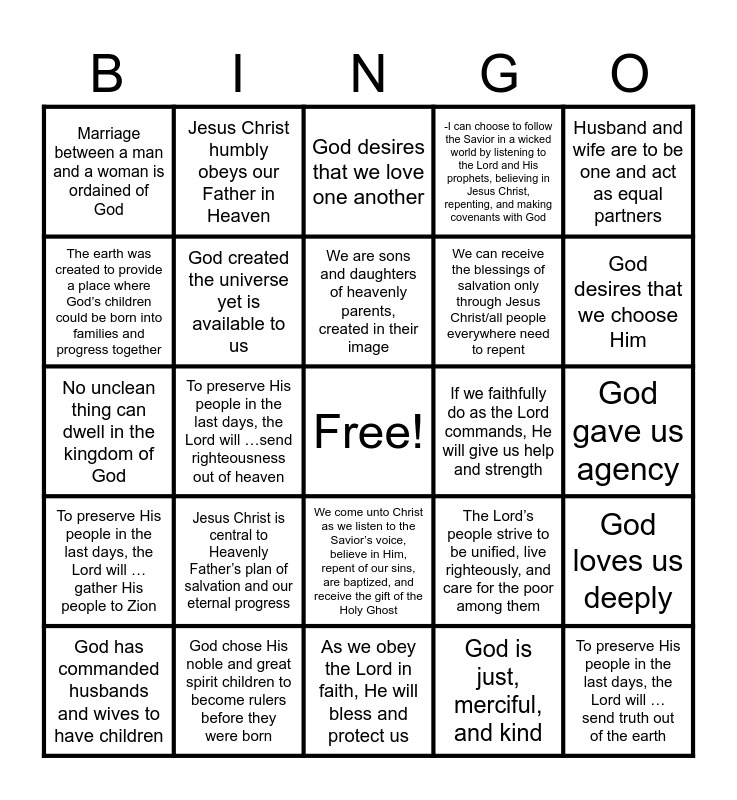This bingo card has a free space and 24 words: Jesus Christ is central to Heavenly Father’s plan of salvation and our eternal progress, God chose His noble and great spirit children to become rulers before they were born, We are sons and daughters of heavenly parents, created in their image, God has commanded husbands and wives to have children, Husband and wife are to be one and act as equal partners, Marriage between a man and a woman is ordained of God, The earth was created to provide a place where God’s children could be born into families and progress together, Jesus Christ humbly obeys our Father in Heaven, If we faithfully do as the Lord commands, He will give us help and strength, We come unto Christ as we listen to the Savior’s voice, believe in Him, repent of our sins, are baptized, and receive the gift of the Holy Ghost, We can receive the blessings of salvation only through Jesus Christ/all people everywhere need to repent, No unclean thing can dwell in the kingdom of God, The Lord’s people strive to be unified, live righteously, and care for the poor among them, God loves us deeply, God created the universe yet is available to us, God is just, merciful, and kind, God gave us agency, God desires that we love one another, God desires that we choose Him, To preserve His people in the last days, the Lord will …send righteousness out of heaven, To preserve His people in the last days, the Lord will …send truth out of the earth, To preserve His people in the last days, the Lord will …gather His people to Zion, -I can choose to follow the Savior in a wicked world by listening to the Lord and His prophets, believing in Jesus Christ, repenting, and making covenants with God and As we obey the Lord in faith, He will bless and protect us.