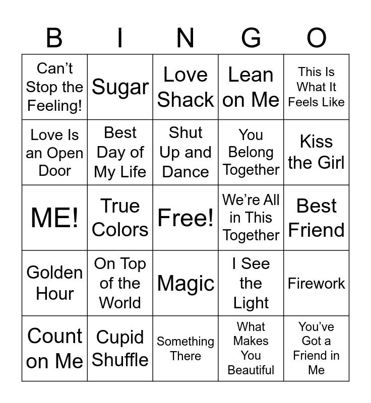 This bingo card has a free space and 39 words: Love You Like a Love Song, Adore You, Lover, Best Day of My Life, Count on Me, Magic, Shut Up and Dance, Dynamite, This Is What It Feels Like, Golden Hour, True Colors, Lean on Me, You’ve Got a Friend in Me, Best Friend, We’re All in This Together, On Top of the World, Happy, Can’t Stop the Feeling!, A Whole New World, I See the Light, Love Is an Open Door, Something There, You Belong Together, Kiss the Girl, How Far I’ll Go, I Wanna Dance with Somebody, Love Story, Crazy Little Thing Called Love, Signed, Sealed, Delivered (I’m Yours), Sugar, I’m a Believer, ABC, Love Shack, Cupid Shuffle, What Makes You Beautiful, Call Me Maybe, Firework, ME! and That’s What Makes You Beautiful.