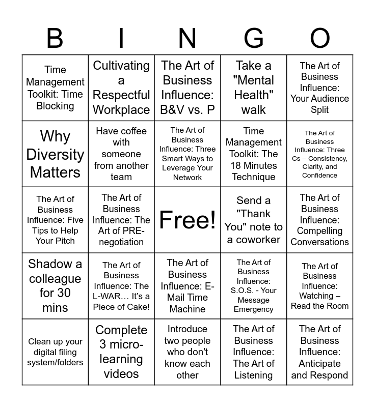 This bingo card has a free space and 42 words: The Art of Business Influence, The Art of Business Influence: Three Smart Ways to Leverage Your Network, The Art of Business Influence: Your Three New Jobs, The Art of Business Influence: The L-WAR… It’s a Piece of Cake!, The Art of Business Influence: The Art of Listening, The Art of Business Influence: Watching – Read the Room, The Art of Business Influence: Anticipate and Respond, The Art of Business Influence: What is Your Differentiator?, The Art of Business Influence: B&V vs. P, The Art of Business Influence: E-Mail Time Machine, The Art of Business Influence: Compelling Conversations, The Art of Business Influence: Three Cs – Consistency, Clarity, and Confidence, The Art of Business Influence: The Art of PRE-negotiation, The Art of Business Influence: Your Audience Split, The Art of Business Influence: Tribal Buying, The Art of Business Influence: S.O.S. - Your Message Emergency, The Art of Business Influence: How to Communicate Change, The Art of Business Influence: Five Tips to Help Your Pitch, The Art of Business Influence: Destination Vs. Journey, Cultivating a Respectful Workplace, Why Diversity Matters, Code of Conduct: Ethics and Professionalism, Be Proactive! Inclusion Starts With You, Time Management Toolkit: Time Blocking, Time Management Toolkit: ABC Analysis, Time Management Toolkit: Taking Back Your Time, Time Management Toolkit: The 18 Minutes Technique, Time Management Toolkit: The Bullet Journal Method, Time Management Toolkit: The Eisenhower Method, Time Management Toolkit: The Pickle Jar Theory, Time Management Toolkit: The Pomodoro Technique, Shadow a colleague for 30 mins, Have coffee with someone from another team, Introduce two people who don't know each other, Give a "Shout-out" to a peer for a specific skill, Clean up your digital filing system/folders, Complete 3 micro-learning videos, Send a "Thank You" note to a coworker, Set a goal for the Month, Journal your "Win of the Day", Take a "Mental Health" walk and Practice a 1-minute breathing exercise.