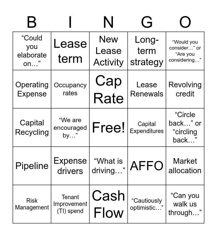 This bingo card has a free space and 27 words: AFFO, Revenue Growth, Lease Renewals, Cash Flow, Operating Expense, New Lease Activity, Lease term, Pipeline, Capital Expenditures, Market allocation, Capital Recycling, Long-term strategy, Risk Management, Tenant Improvement (TI) spend, Revolving credit, Balance Sheet, Occupancy rates, Cap Rate, Expense drivers, “Could you elaborate on…”, “Circle back…” or “circling back…”, “Cautiously optimistic…”, “We are encouraged by…”, “Can you walk us through…”, “What is driving…”, “Would you consider…” or “Are you considering…” and Someone audibly sneezes or clears their throat.