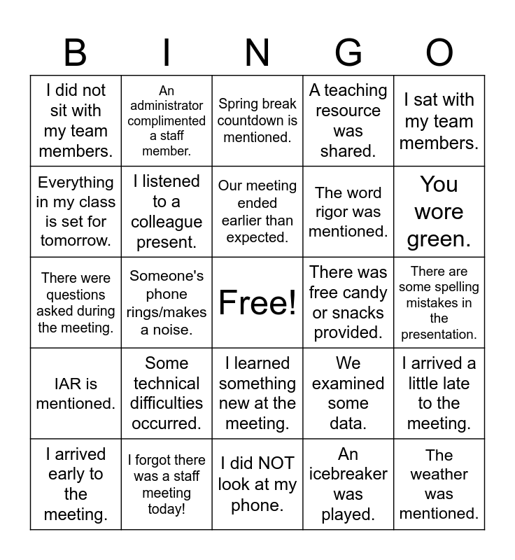This bingo card has a free space and 24 words: Some technical difficulties occurred., I forgot there was a staff meeting today!, Our meeting ended earlier than expected., I arrived early to the meeting., I sat with my team members., I did not sit with my team members., Everything in my class is set for tomorrow., An administrator complimented a staff member., There was free candy or snacks provided., I learned something new at the meeting., The word rigor was mentioned., There were questions asked during the meeting., We examined some data., I arrived a little late to the meeting., I listened to a colleague present., An icebreaker was played., There are some spelling mistakes in the presentation., Spring break countdown is mentioned., You wore green., Someone's phone rings/makes a noise., The weather was mentioned., IAR is mentioned., A teaching resource was shared. and I did NOT look at my phone..