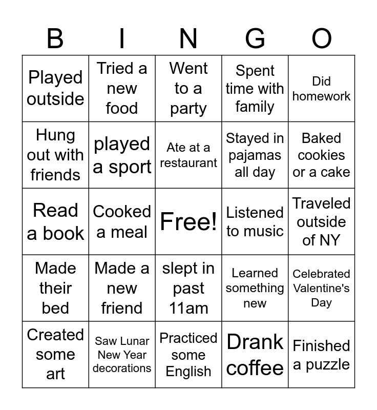 This bingo card has a free space and 35 words: Watched a movie, Played videogames, worked out at the gym, played a sport, slept in past 11am, Spent time with family, Hung out with friends, Went shopping, Ate at a restaurant, Went to the movies (cinema), Read a book, Did homework, Visited a friend, Went to a museum, Played outside, Listened to music, Drank coffee, Cooked a meal, Made their bed, Finished a puzzle, Learned something new, Created some art, Celebrated Valentine's Day, Saw Lunar New Year decorations, Went to a party, Baked cookies or a cake, Stayed up past 2am, Shoveled snow, Stayed in pajamas all day, Traveled outside of NY, Had a birthday, Practiced some English, Made a new friend, Tried a new food and Watched the Winter Olympics.