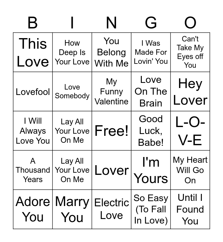 This bingo card has a free space and 26 words: Lover, So Easy (To Fall In Love), My Funny Valentine, Marry You, Can't Take My Eyes off You, This Love, Lovefool, How Deep Is Your Love, L-O-V-E, I'm Yours, Love On The Brain, I Will Always Love You, My Heart Will Go On, Adore You, Lay All Your Love On Me, Bad Romance, I Was Made For Lovin' You, A Thousand Years, You Belong With Me, Until I Found You, Hey Lover, Electric Love, Good Luck, Babe!, Lay All Your Love On Me, Love Somebody and The One That Got Away.