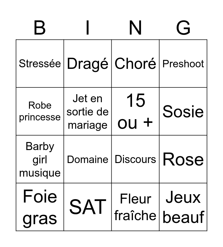 This bingo card has 16 words: SAT, Rose, Choré, Stressée, Barby girl musique, Dragé, Discours, Fleur fraîche, Robe princesse, Jet en sortie de mariage, Foie gras, Preshoot, Domaine, Sosie, 15 ou + and Jeux beauf.
