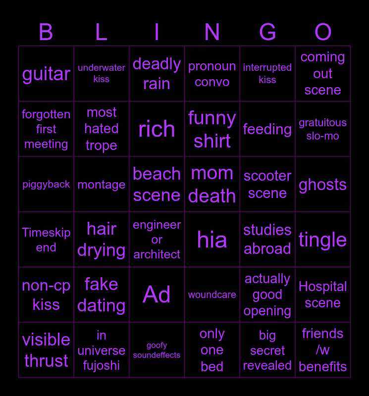 This bingo card has 36 words: woundcare, Ad, only one bed, forgotten first meeting, Timeskip end, mom death, most hated trope, goofy soundeffects, interrupted kiss, actually good opening, gratuitous slo-mo, pronoun convo, Hospital scene, montage, funny shirt, guitar, non-cp kiss, scooter scene, piggyback, deadly rain, beach scene, hair drying, hia, engineer or architect, studies abroad, underwater kiss, feeding, in universe fujoshi, rich, coming out scene, friends /w benefits, visible thrust, tingle, ghosts, fake dating and big secret revealed.