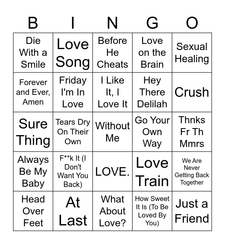 This bingo card has 29 words: Head Over Feet, Fallin', Tears Dry On Their Own, Just a Friend, Die With a Smile, Before He Cheats, Friday I'm In Love, F**k It (I Don't Want You Back), Go Your Own Way, At Last, Thnks Fr Th Mmrs, Without Me, What About Love?, How Sweet It Is (To Be Loved By You), Crush, Baby, LOVE., Always Be My Baby, Sexual Healing, Sure Thing, Love Train, Man I Need, Hey There Delilah, Forever and Ever, Amen, Love on the Brain, Love Song, We Are Never Getting Back Together, I Like It, I Love It and I Will Always Love You.