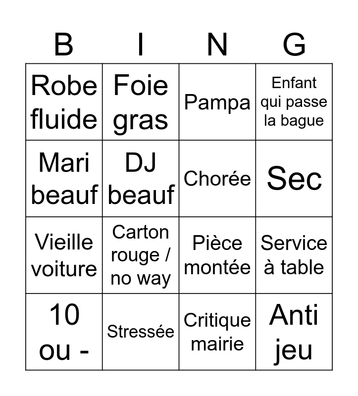 This bingo card has 16 words: Stressée, Service à table, Pampa, Robe fluide, Vieille voiture, Foie gras, Pièce montée, Critique mairie, Mari beauf, DJ beauf, 10 ou -, Enfant qui passe la bague, Carton rouge / no way, Sec, Chorée and Anti jeu.