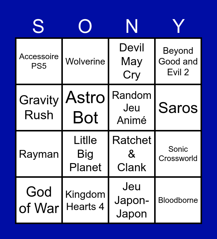 This bingo card has 16 words: Kingdom Hearts 4, Sonic Crossworld, Devil May Cry, Accessoire PS5, Rayman, Wolverine, Ratchet & Clank, Jeu Japon-Japon, Gravity Rush, Astro Bot, God of War, Beyond Good and Evil 2, Litlle Big Planet, Saros, Random Jeu Animé and Bloodborne.