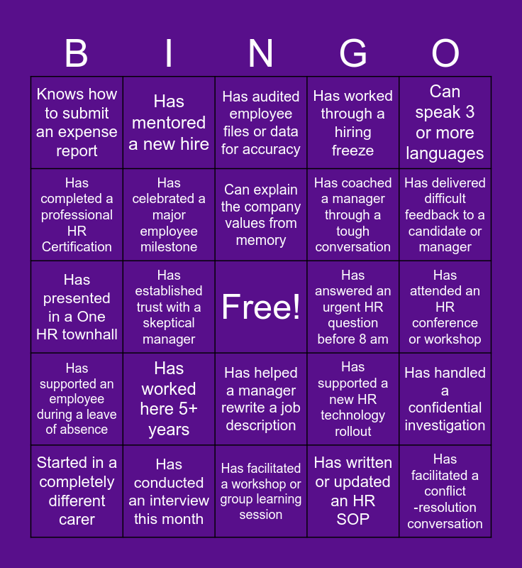This bingo card has a free space and 24 words: Has worked here 5+ years, Has conducted an interview this month, Can explain the company values from memory, Started in a completely different carer, Can speak 3 or more languages, Knows how to submit an expense report, Has completed a professional HR Certification, Has mentored a new hire, Has answered an urgent HR question before 8 am, Has helped a manager rewrite a job description, Has coached a manager through a tough conversation, Has presented in a One HR townhall, Has supported a new HR technology rollout, Has handled a confidential investigation, Has celebrated a major employee milestone, Has written or updated an HR SOP, Has attended an HR conference or workshop, Has audited employee files or data for accuracy, Has delivered difficult feedback to a candidate or manager, Has established trust with a skeptical manager, Has facilitated a conflict ‑resolution conversation, Has supported an employee during a leave of absence, Has worked through a hiring freeze and Has facilitated a workshop or group learning session.
