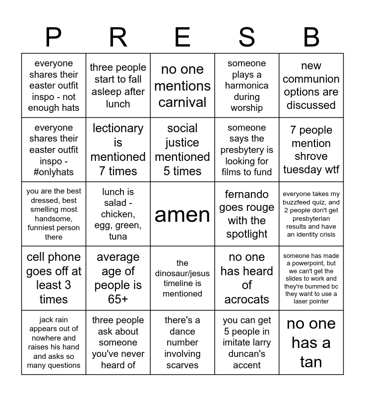 This bingo card has a free space and 24 words: average age of people is 65+, three people ask about someone you've never heard of, social justice mentioned 5 times, jack rain appears out of nowhere and raises his hand and asks so many questions, new communion options are discussed, everyone shares their easter outfit inspo - not enough hats, everyone shares their easter outfit inspo - #onlyhats, three people start to fall asleep after lunch, fernando goes rouge with the spotlight, the dinosaur/jesus timeline is mentioned, someone says the presbytery is looking for films to fund, you are the best dressed, best smelling most handsome, funniest person there, no one has heard of acrocats, someone has made a powerpoint, but we can't get the slides to work and they're bummed bc they want to use a laser pointer, lectionary is mentioned 7 times, you can get 5 people in imitate larry duncan's accent, everyone takes my buzzfeed quiz, and 2 people don't get presbyterian results and have an identity crisis, no one mentions carnival, 7 people mention shrove tuesday wtf, lunch is salad - chicken, egg, green, tuna, no one has a tan, cell phone goes off at least 3 times, someone plays a harmonica during worship and there's a dance number involving scarves.