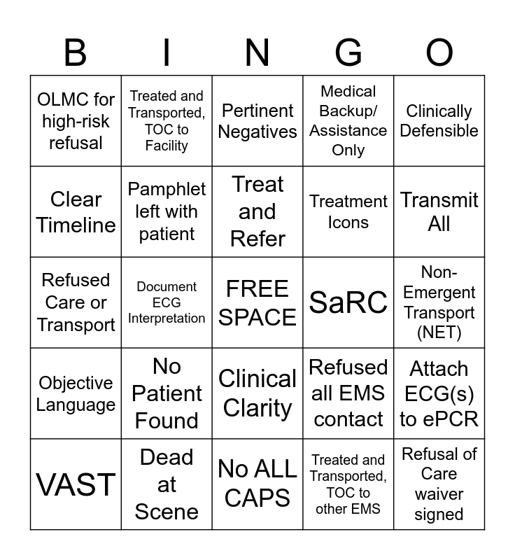 This bingo card has a free space and 27 words: Refused all EMS contact, CHART, Treatment Icons, No ALL CAPS, Clear Timeline, Pertinent Negatives, Treated and Transported, TOC to Facility, Objective Language, SaRC, Attach ECG(s) to ePCR, Refused Care or Transport, Medical Backup/ Assistance Only, VAST, Dead at Scene, Transmit All, SOAP, Pamphlet left with patient, Treat and Refer, No Patient Found, OLMC for high-risk refusal, Non-Emergent Transport (NET), Treated and Transported, TOC to other EMS, Document ECG Interpretation, Refusal of Care waiver signed, Clinical Clarity, Clinically Defensible and Subjective Language.