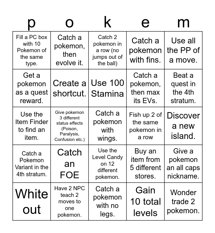 This bingo card has 34 words: Wonder trade 2 pokemon., Gain 10 total levels, Sail anywhere on the sea, then sail back to where you started without sinking., Obtain a new TM, Catch a Pokemon Variant in the 4th stratum., Create a shortcut., Use all the PP of a move., White out, Catch a pokemon, then evolve it., Beat a trainer at the Battle House., Use 100 Stamina, Catch 2 pokemon in a row (no jumps out of the ball), Win the lottery, Rename a pokemon "BellyJean", Fish up 2 of the same pokemon in a row, Beat a quest in the 4th stratum., Have 2 NPC teach 2 moves to one pokemon., Use the Item Finder to find an item., Catch an FOE, Buy an item from 5 different stores., Use the Level Candy on 12 different pokemon., Have $100,000 on hand., Fill a PC box with 10 Pokemon of the same type., Discover a new island., Catch a pokemon with no legs., Catch a pokemon with wings., Catch a pokemon with fins., Catch a pokemon with 4 legs., Catch a pokemon, then max its EVs., Get a pokemon as a quest reward., One shot a pokemon that is equal or higher level., Give pokemon 3 different status effects (Poison, Paralysis, Confusion etc.), Give a pokemon an all caps nickname. and Have a pokemon learn a move that only exists in this game by leveling up..