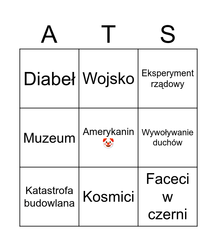 This bingo card has a free space and 12 words: Opętanie, UFO, Faceci w czerni, Wywoływanie duchów, Wojsko, Eksperyment rządowy, Kosmici, Dziwne teorie fizyczne, Diabeł, Muzeum, Katastrofa budowlana and Stwór z ciemności.