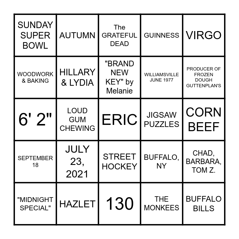 This bingo card has a free space and 36 words: TIE DYE, FINN & FERGIE, The LOVELY SUE, HILLARY & LYDIA, BUFFALO, NY, SEPTEMBER 18, "BRAND NEW KEY" by Melanie, BLAZING SADDLES, VIRGO, LENNY, JERRY, JOEL, LOUD GUM CHEWING, GUINNESS, NIGHT OWL, JIGSAW PUZZLES, PRODUCER OF FROZEN DOUGH GUTTENPLAN'S, SUNDAY SUPER BOWL, SUE'S KITCHEN, JULY 23, 2021, BUFFALO BILLS, The GRATEFUL DEAD, CORN BEEF, CHAD, BARBARA, TOM Z., HAZLET, "MIDNIGHT SPECIAL", 130, AUTUMN, 6' 2", THE TIMEKEEPER, WILLIAMSVILLE JUNE 1977, WOODWORK & BAKING, DATSUN 510 WAGON, SMALLWOOD ELEMENTARY, THE MONKEES, STREET HOCKEY, UGG SLIPPERS, TIE-DIE-T's, & JEANS and GOLF.