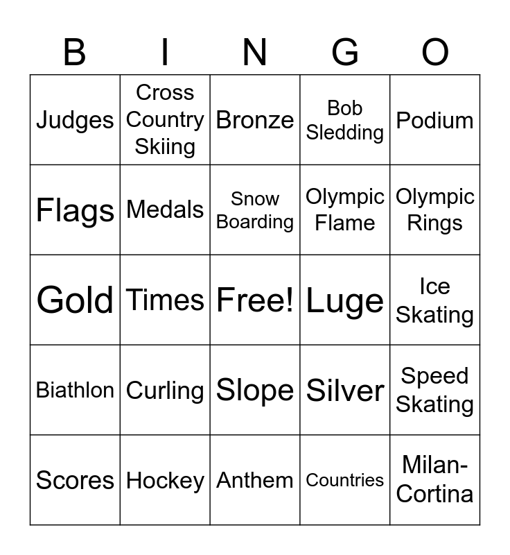 This bingo card has a free space and 24 words: Curling, Hockey, Snow Boarding, Scores, Podium, Judges, Flags, Cross Country Skiing, Luge, Slope, Olympic Flame, Gold, Silver, Speed Skating, Medals, Countries, Ice Skating, Bronze, Olympic Rings, Times, Milan-Cortina, Biathlon, Bob Sledding and Anthem.