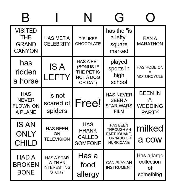 This bingo card has a free space and 34 words: HAS A BIRTHDAY THIS MONTH, CAN PLAY AN INSTRUMENT, HAS A TATTOO, CAN SPEAK A FOREIGN LANGUAGE, IS AN ONLY CHILD, IS A LEFTY, RAN A MARATHON, HAD A BROKEN BONE, HAS MET A CELEBRITY, HAS LIVED IN ANOTHER STATE, HAS A PET (BONUS IF THE PET IS NOT A DOG OR CAT), DISLIKES CHOCOLATE, HAD BRACES, HAS A PIERCING OTHER THAN EARS, HAS NEVER SEEN A STAR WARS FILM, HAS RODE ON A MOTORCYCLE, HAS A SCAR WITH AN INTERESTING STORY, HAS NEVER FLOWN ON A PLANE, HAS BEEN ON TELEVISION, HAS BEEN THROUGH AN EARTHQUAKE, TORNADO OR HURRICANE, HAS PRANK CALLED SOMEONE, HAS GONE WATER SKIING, VISITED THE GRAND CANYON, BEEN IN A WEDDING PARTY, Has a food allergy, Has a large collection of something, has the "is a lefty" square marked, has performed in a talent show, played sports in high school, has ridden a horse, locked themselves out of their house or car, is not scared of spiders, milked a cow and Been to prom.