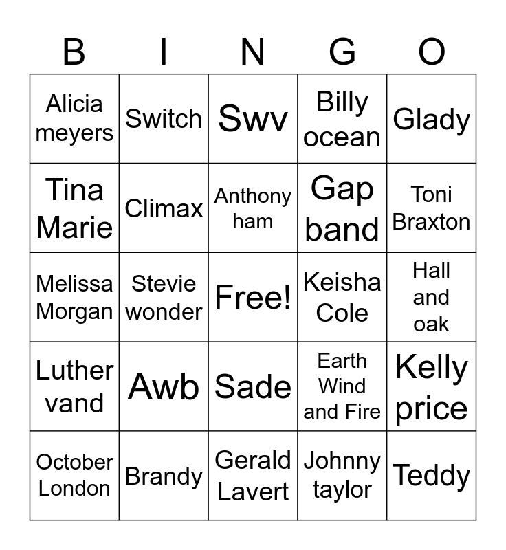 This bingo card has a free space and 29 words: October London, Mary j, Stevie wonder, Kenny logins, Alicia meyers, Swv, Climax, Awb, Keisha Cole, Brandy, Hall and oak, Teddy, Gerald Lavert, Johnny taylor, Toni Braxton, Anita baker, Sade, Luther vand, Glady, Melissa Morgan, Earth Wind and Fire, Chaka, Gap band, Tina Marie, Billy ocean, Switch, Kelly price, Anthony ham and Kendrick family soul.