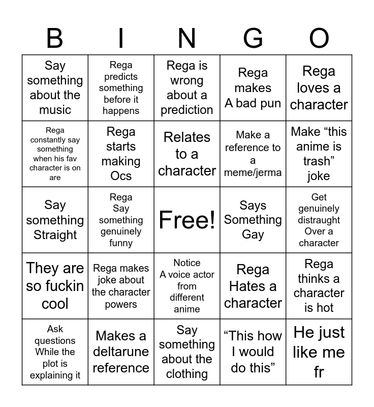 This bingo card has a free space and 24 words: Rega makes joke about the character powers, Makes a deltarune reference, Relates to a character, Ask questions While the plot is explaining it, Rega loves a character, Say something about the music, Rega constantly say something when his fav character is on are, Rega predicts something before it happens, Says Something Gay, Notice A voice actor from different anime, Make a reference to a meme/jerma, Say something Straight, Rega Hates a character, Rega thinks a character is hot, Rega starts making Ocs, “This how I would do this”, Get genuinely distraught Over a character, Rega is wrong about a prediction, Make “this anime is trash” joke, Rega Say something genuinely funny, He just like me fr, They are so fuckin cool, Rega makes A bad pun and Say something about the clothing.