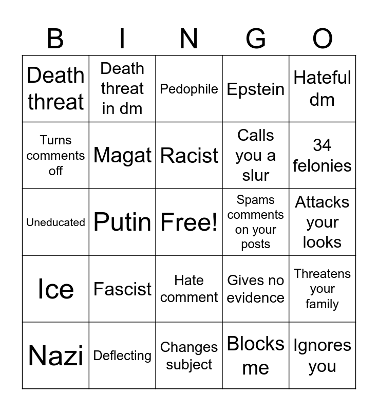This bingo card has a free space and 24 words: Nazi, Fascist, Racist, Blocks me, Hateful dm, Death threat, Death threat in dm, Pedophile, Spams comments on your posts, Attacks your looks, Uneducated, Magat, Gives no evidence, Threatens your family, Turns comments off, Deflecting, Changes subject, Epstein, 34 felonies, Ice, Putin, Hate comment, Calls you a slur and Ignores you.