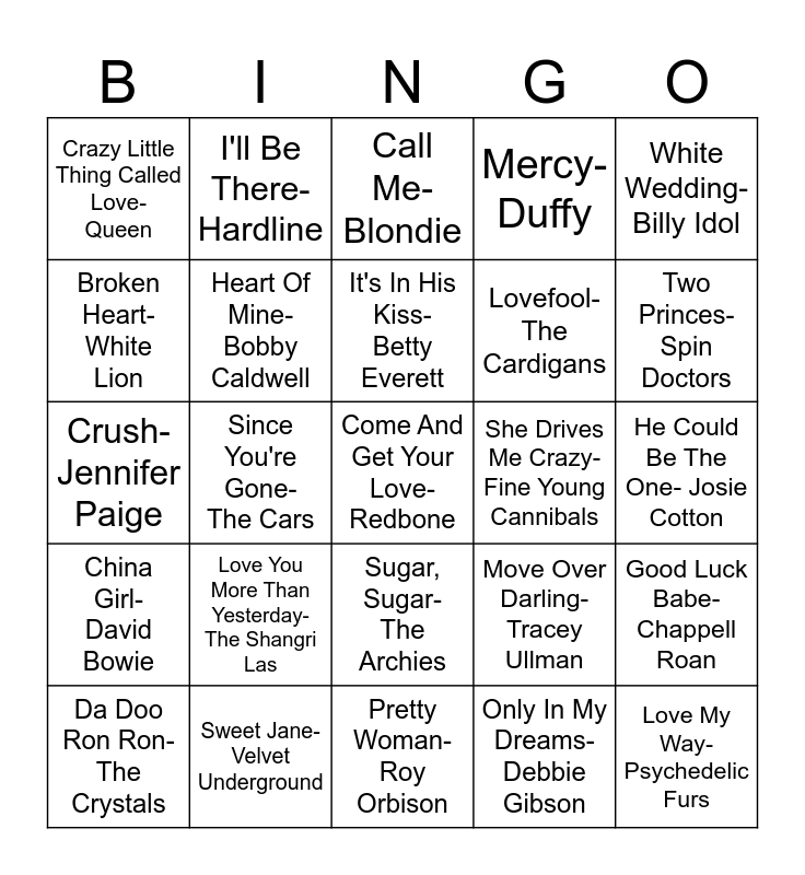 This bingo card has 25 words: Love You More Than Yesterday- The Shangri Las, Pretty Woman- Roy Orbison, It's In His Kiss- Betty Everett, Da Doo Ron Ron- The Crystals, White Wedding- Billy Idol, Crazy Little Thing Called Love- Queen, Broken Heart- White Lion, I'll Be There- Hardline, She Drives Me Crazy- Fine Young Cannibals, Sugar, Sugar- The Archies, Lovefool- The Cardigans, Crush- Jennifer Paige, Move Over Darling- Tracey Ullman, Good Luck Babe- Chappell Roan, Heart Of Mine- Bobby Caldwell, Love My Way- Psychedelic Furs, He Could Be The One- Josie Cotton, Call Me- Blondie, Two Princes- Spin Doctors, Since You're Gone- The Cars, Come And Get Your Love- Redbone, Sweet Jane- Velvet Underground, China Girl- David Bowie, Mercy- Duffy and Only In My Dreams- Debbie Gibson.