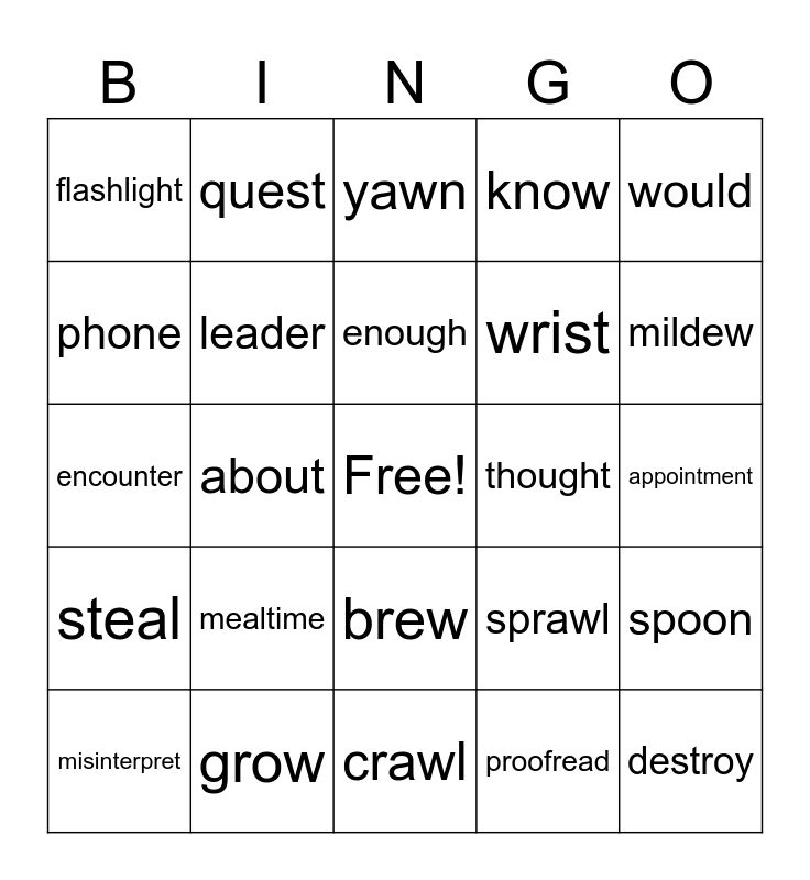This bingo card has a free space and 29 words: misinterpret, entertainment, about, sprain, flashlight, yawn, leader, mealtime, thought, grow, appointment, destroy, crawl, proofread, mildew, August, brew, steal, would, encounter, sprawl, hound, wrist, phone, know, quest, spoon, enough and beach.