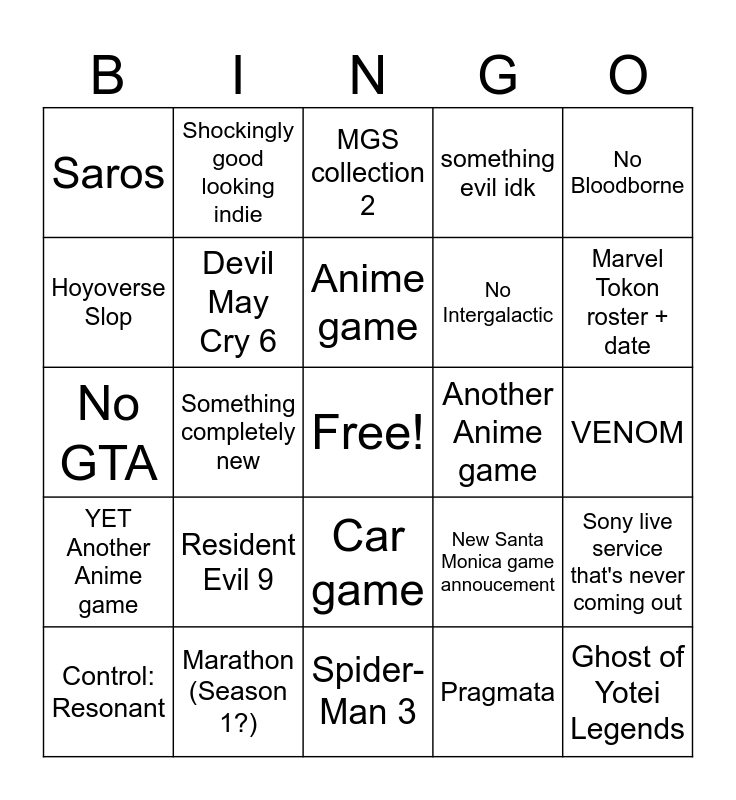 This bingo card has a free space and 24 words: Resident Evil 9, Marathon (Season 1?), Anime game, Control: Resonant, No Bloodborne, Saros, Hoyoverse Slop, Shockingly good looking indie, Another Anime game, Car game, No Intergalactic, No GTA, New Santa Monica game annoucement, Sony live service that's never coming out, Devil May Cry 6, Pragmata, VENOM, MGS collection 2, Marvel Tokon roster + date, Something completely new, Ghost of Yotei Legends, YET Another Anime game, something evil idk and Spider-Man 3.