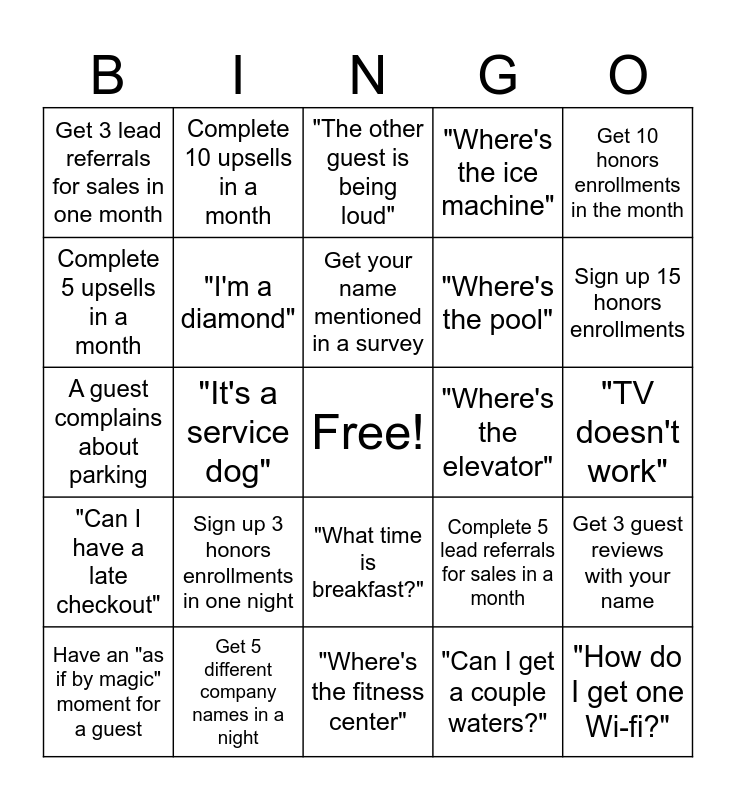 This bingo card has a free space and 24 words: Sign up 3 honors enrollments in one night, Get 5 different company names in a night, Get your name mentioned in a survey, Have an "as if by magic" moment for a guest, Get 10 honors enrollments in the month, Get 3 lead referrals for sales in one month, Complete 5 upsells in a month, Complete 10 upsells in a month, "Where's the elevator", "What time is breakfast?", "Where's the pool", A guest complains about parking, Complete 5 lead referrals for sales in a month, Get 3 guest reviews with your name, "I'm a diamond", "Can I get a couple waters?", "TV doesn't work", "The other guest is being loud", Sign up 15 honors enrollments, "It's a service dog", "How do I get one Wi-fi?", "Can I have a late checkout", "Where's the ice machine" and "Where's the fitness center".