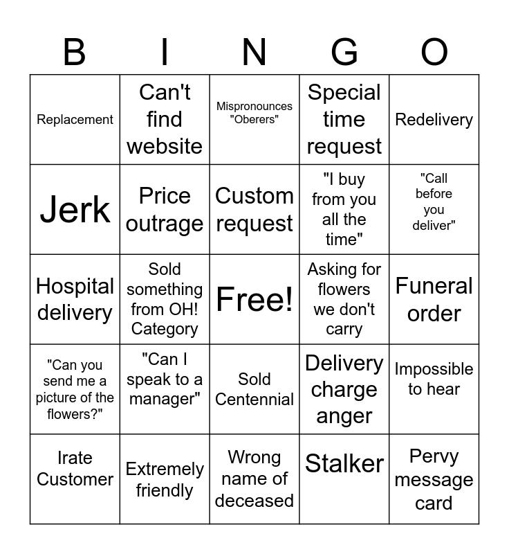 This bingo card has a free space and 24 words: Irate Customer, "Can I speak to a manager", Custom request, Stalker, Redelivery, Replacement, Can't find website, Mispronounces "Oberers", Asking for flowers we don't carry, Funeral order, Hospital delivery, Price outrage, Delivery charge anger, Impossible to hear, Jerk, Extremely friendly, Wrong name of deceased, Special time request, "Call before you deliver", "Can you send me a picture of the flowers?", Sold something from OH! Category, Sold Centennial, "I buy from you all the time" and Pervy message card.