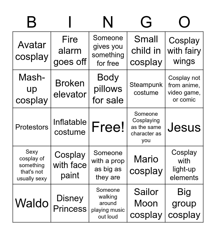 This bingo card has a free space and 32 words: Sailor Moon cosplay, Dragon Ball Z cosplay, Inflatable costume, Meme cosplay, Sexy cosplay of something that's not usually sexy, Broken elevator, Cosplay with fairy wings, Cosplay with light-up elements, Fire alarm goes off, That hentai shirt, Body pillows for sale, Someone gives you something for free, Get a photo with someone in a fursuit, Star Wars cosplay, Someone Cosplaying as the same character as you, Someone with a sign (who's not Haley), Waldo, Protestors, Someone with a prop as big as they are, Cosplay with face paint, Mario cosplay, Sexy Pokémon cosplay, Jesus, Disney Princess, Big group cosplay, Small child in cosplay, Steampunk costume, Mash-up cosplay, Avatar cosplay, Someone walking around playing music out loud, Cute couples cosplay and Cosplay not from anime, video game, or comic.